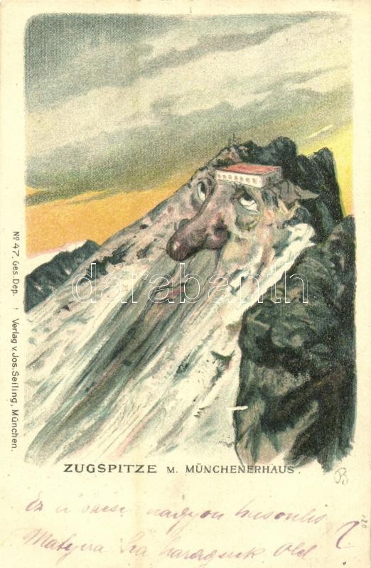 1898 Zugspitze m. Münchenerhaus. No. 47. Verlag v. Jos. Seiling, München / Mountain with a human face, litho