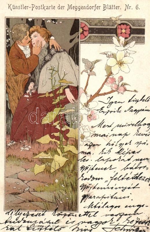 1899 Art Nouveau couple. Künstler-Postkarte der Meggendorfer Blätter Nr. 6. Verlag von J.F. Schreiber floral, litho s: Koloman Moser