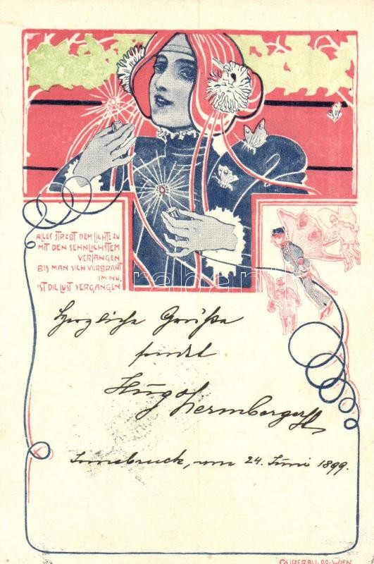 1899 Art Nouveau lady with light bulbs. Franz Schöler Wien XIX. s: G. Liberali
