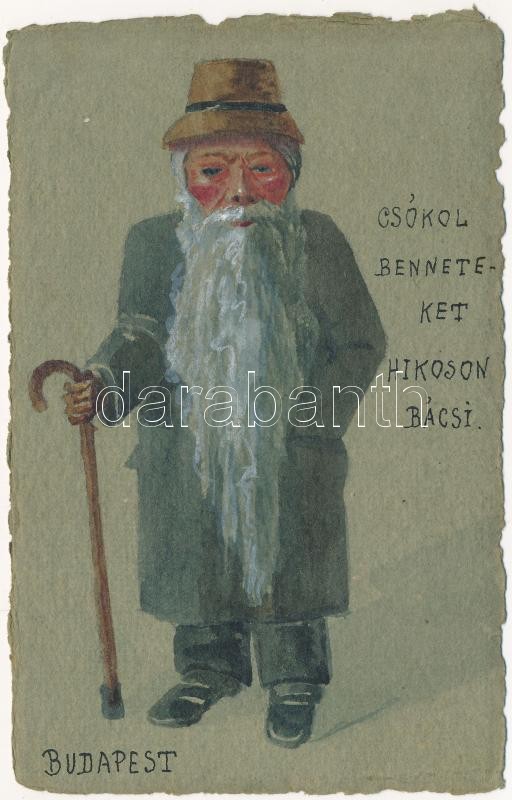 1913 Budapest, Csókol benneteket Hikoson bácsi. Kézzel festett művészlap / Hungarian hand-painted art postcard