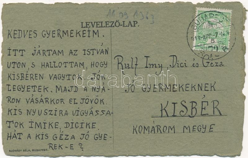 1913 Budapest, Csókol benneteket Hikoson bácsi. Kézzel festett művészl...