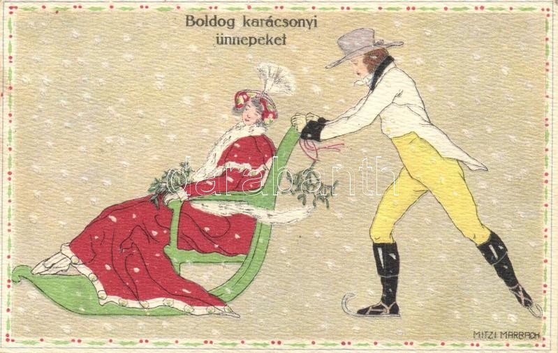 Boldog Karácsonyi Ünnepeket! / Christmas greeting art postcard with ice skating man and sledding lady. B.K.W.I. 3091-5. s: Mitzi Marbach