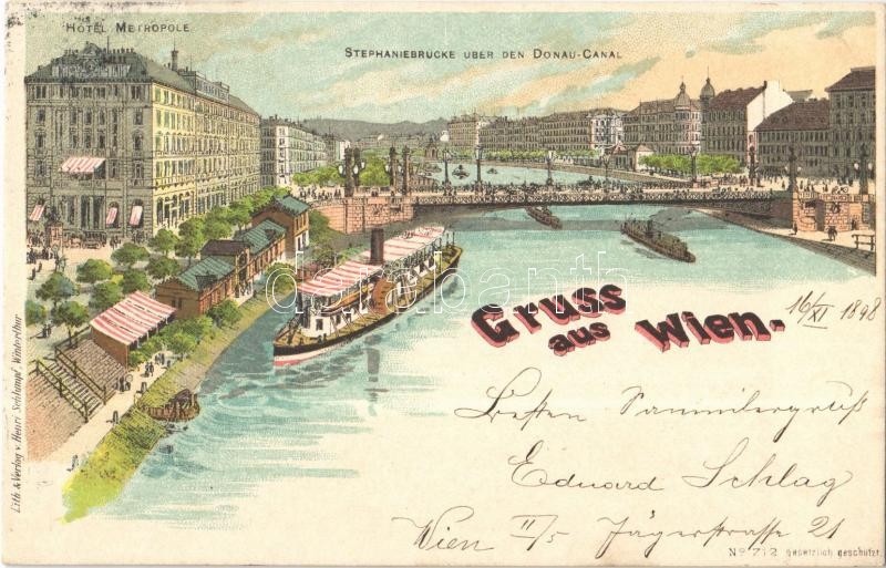 1898 Wien, Vienna, Bécs; Stephaniebrücke uber den Donau Canal / bridge over the Danube, Hotel Metropole. Henri Schlumpf litho