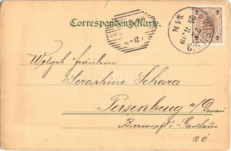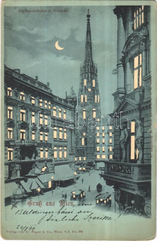 Description: 1899 Wien, Vienna, Bécs; Stefanskirche v. Graben, Zahnartzt. Verlag von G. Rüger & Co. / church, trams, dentist, shops, New York, night. Hold to light litho (EK)
