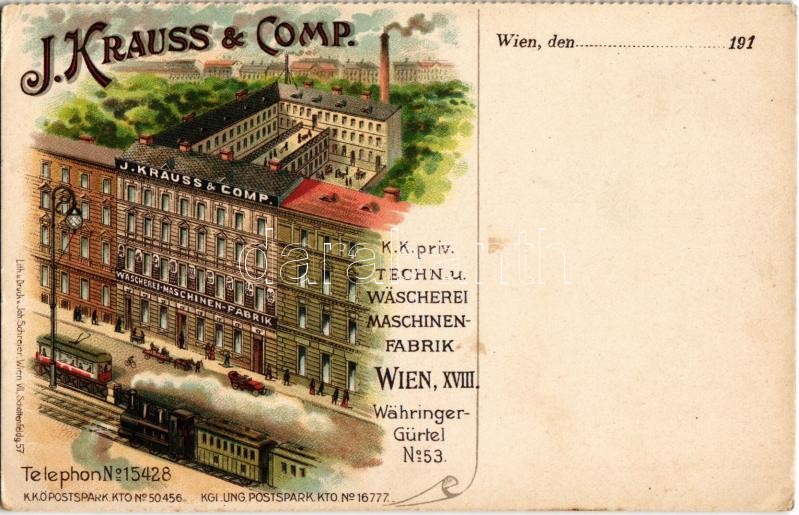 Wien, Vienna, Bécs XVIII. J. Krauss & Comp. K.k. priv. Techn. und Wäscherei Maschinenfabrik. Währinger-Gürtel No. 53. / Viennese techn. and laundry machine factory's advertisement, locomotive and tram. Joh. Schreier litho (EK)