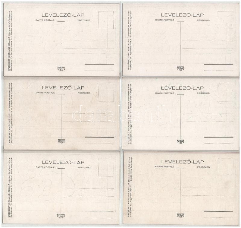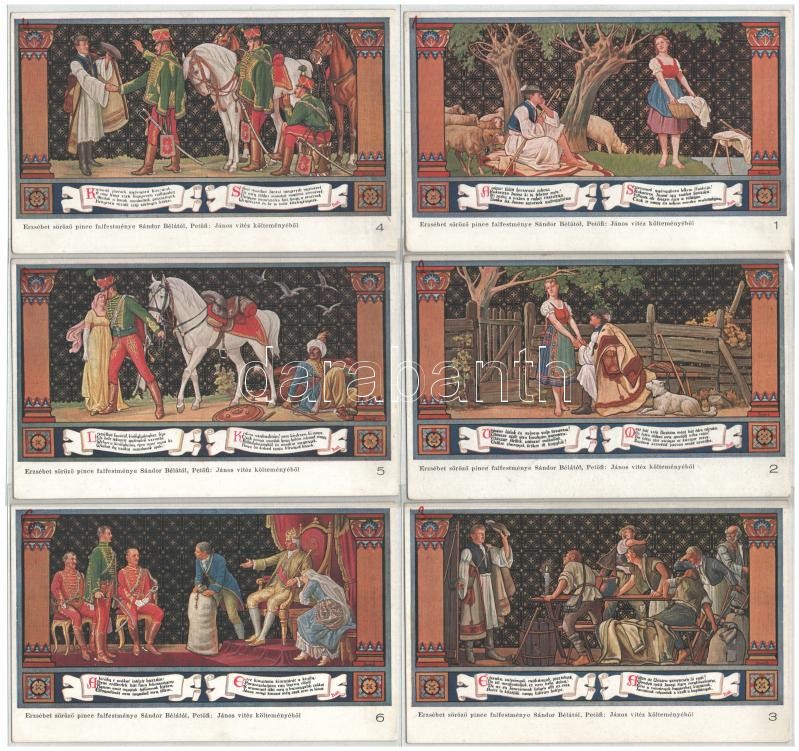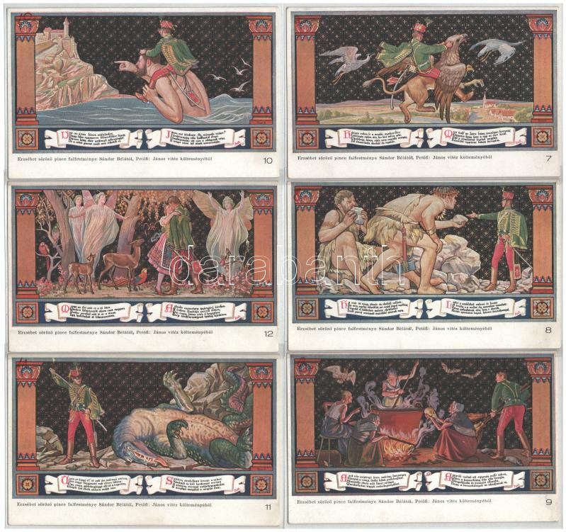 Description: Budapest V. Egyetem utca 5. Erzsébet Királyné Szálló étterem és söröző pince, Sándor Béla falfestménye Petőfi Sándor János vitézéből - 12 db régi képeslap a teljes sorozat / 12 pre-1945 art postcards, the whole series