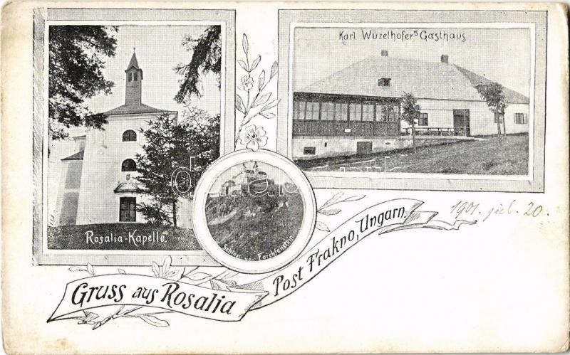 Fraknó, Forchtenstein; vár, Karl Wurzlhofer vendéglője, Rozália kápolna / Schloss, Gasthaus, Rosalia Kapelle / castle, restaurant, chapel. Art Nouveau, floral (kopott sarkak / worn corners)