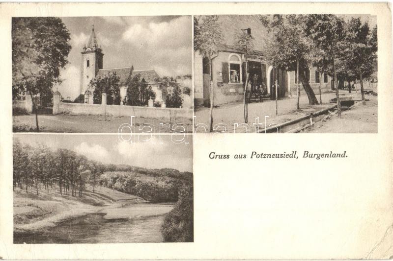 Lajtafalu, Potzneusiedl; templom, Spiegel testvérek üzlete és saját kiadása / Kirche, Gebrüder Spiegel Geschäft / church, shop (fa)