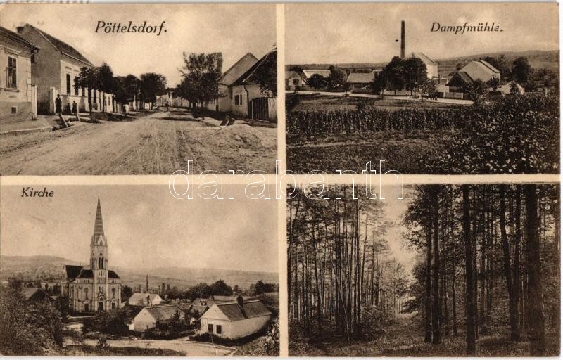 Petőfalva, Pöttelsdorf; utca, templom, erdő, Gőzmalom / Strasse, Kirch...