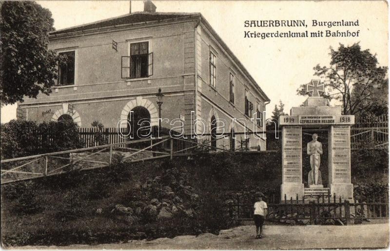 Savanyúkút, Sauerbrunn; Kriegerdenkmal mit Bahnhof / Hősök szobra és v...