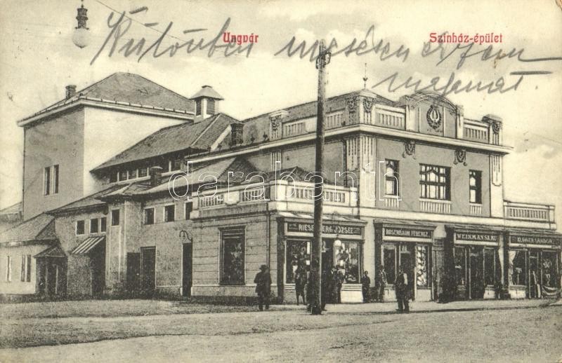 1908 Ungvár, Uzshorod, Uzhorod; Színház épület, Riesenberg József, Rosenbaum Ferenc, Weinman Samu és Klinger Sándor üzlete / theatre, shops