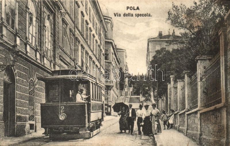 Pola, Pula; utcakép villamossal / Via della specola / street view with tram. G. Costalunga 1909. (fl)