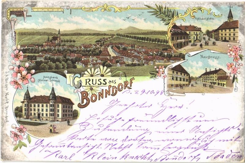 1898 Bonndorf, Rathausplatz, Neustrasse, Amtshaus (Ehemal Schloss) / town hall, street, square, castle. J.A. Binder Art Nouveau, floral, litho