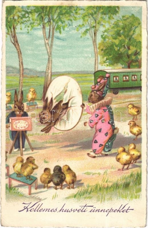 Kellemes Húsvéti Ünnepeket! Nyúl cirkusz / Easter greeting art postcar...