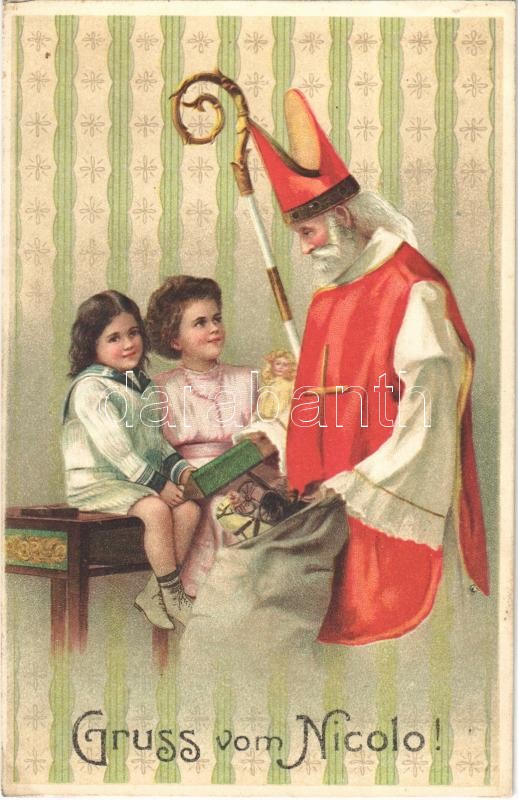 Mikulás / Grüss vom Nicolo! / Saint Nicholaus greeting art postcard. M...