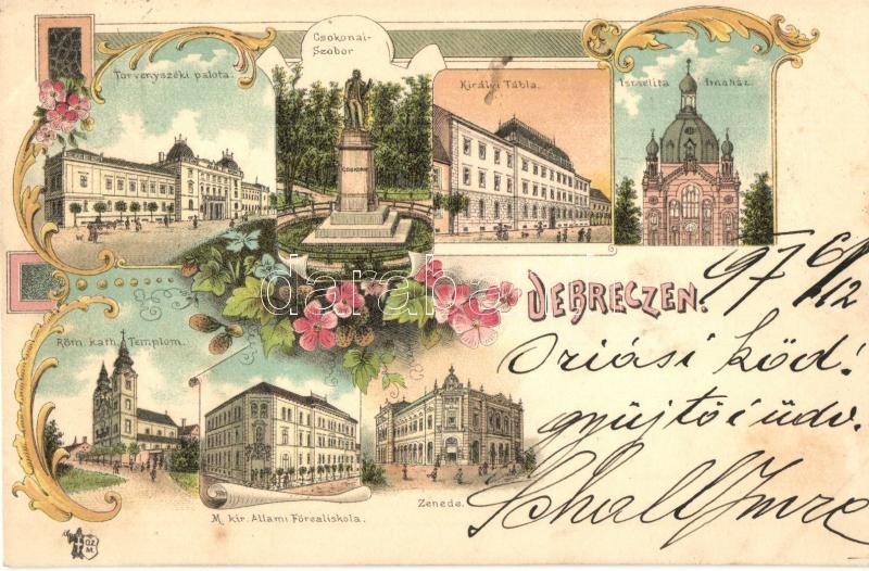 1897 (Vorläufer!) Debrecen, Királyi tábla, Törvényszéki palota, Csokonai szobor, Izraelita imaház, zsinagóga, Zenede, Állami főreáliskola, Római katolikus templom. Art Nouveau, floral, litho