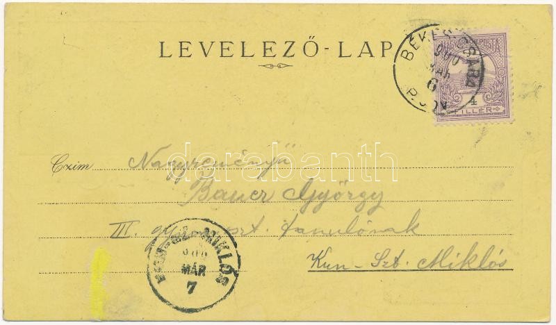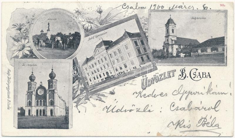 1900 Békéscsaba, Artézi kút, Katolikus és izraelita templom, zsinagóga, Rudolf gimnázium. Dohánynagytőzsde kiadása. Art Nouveau, floral (r)