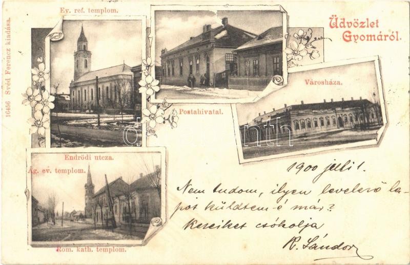 1900 Gyoma (Gyomaendrőd), Református, ágostai evangélikus és római katolikus templom, postahivatal, városháza, tél. Svéd Ferenc kiadása (Rb)