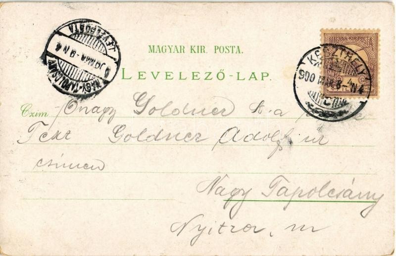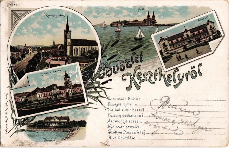 1900 Keszthely, látkép, Festetics palota, kastély, Hullám és Balaton szálloda. Mérei Ignác No. 687. Art Nouveau, floral, litho