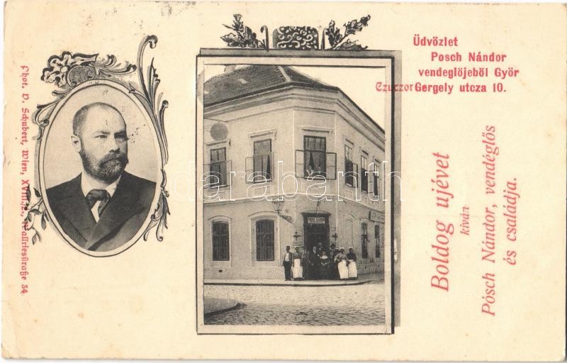 1902 Győr, Pósch Nándor vendéglője és arcképe. Czuczor Gergely utca 10. Art Nouveau, Újévi üdvözlet (EK)