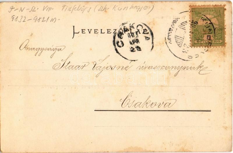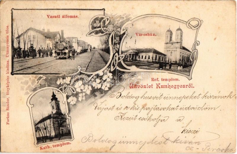1905 Kunhegyes, vasútállomás gőzmozdonnyal, városház, Katolikus és református templom. kiadja Farkas Sándor, Art Nouveau, floral (fl)
