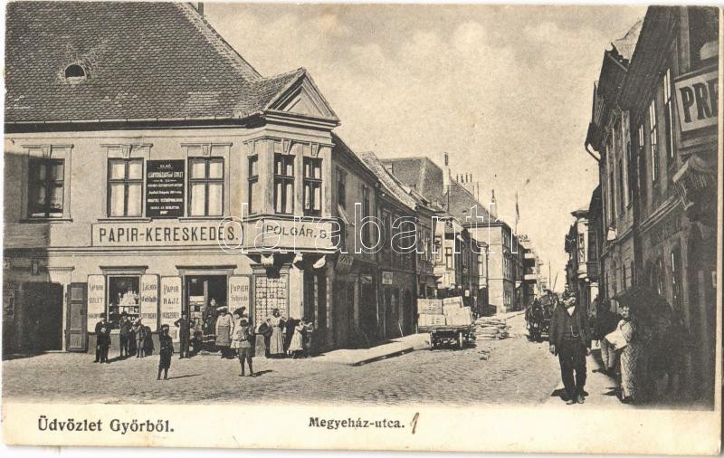 1906 Győr, Megyeház utca, Polgár B. papírkereskedése, az Első Leánykih...