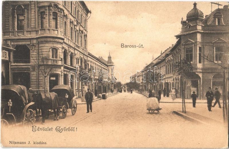 1908 Győr, Baross út, lovashintók. Nitsmann J. kiadása