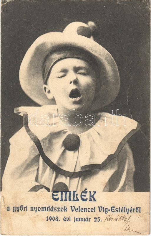1908 Győr, Emlék a győri nyomdászok Velencei Víg-Estélyéről január 25-én. Bohóc kisfiú, reklám (ázott sarok / wet corner)
