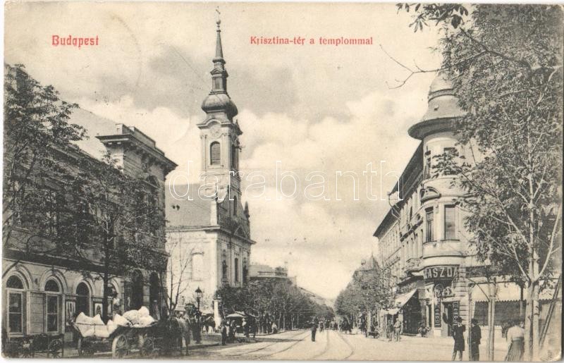 1909 Budapest I. Krisztina tér, cukrászda, gyógyszertár, templom