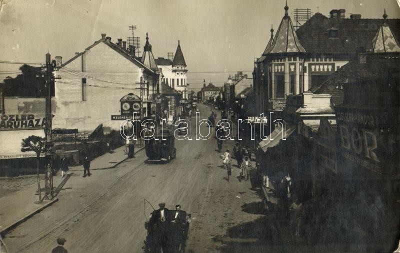 1929 Szolnok, utca, Kelemen József kerékpár és írógép üzlete, Hangya, Réti testvérek boltja, autóbusz, lovaskocsi. Bánó E. fényképész (EK)