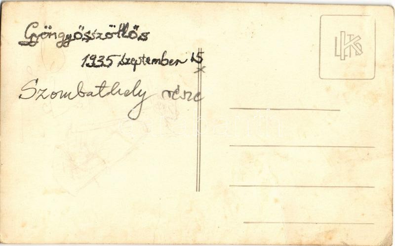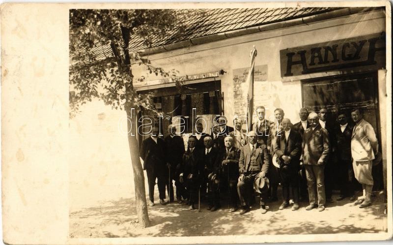 1935 Gyöngyösszőlős (Szombathely), Urak köre zászlóval a Hangya üzlet ...