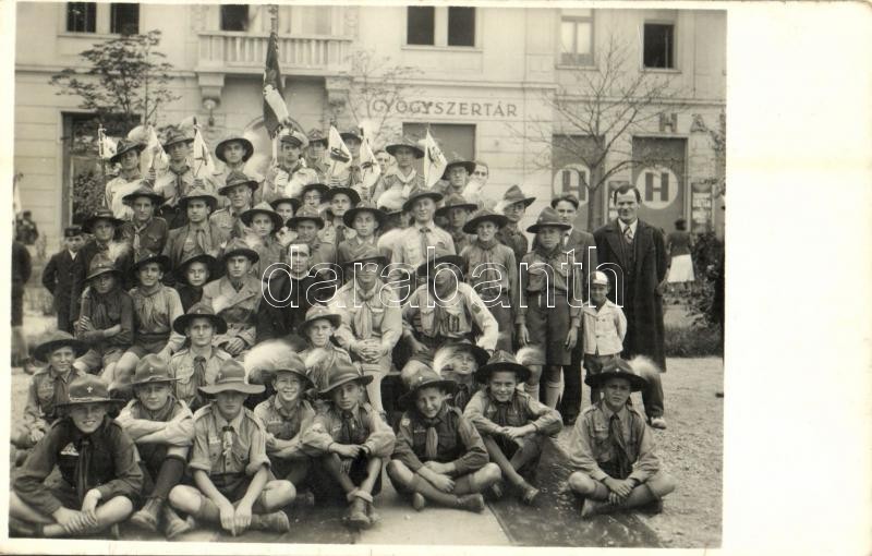 1939 Budapest XVI. Rákosszentmihály, Szent Imre cserkészcsapat csoportképe a gyógyszertár előtt. Károlyi Foto, photo