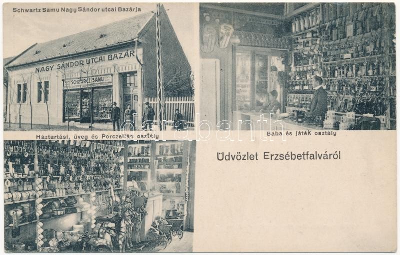 Description: Budapest XX. Pestszenterzsébet, Pesterzsébet, Erzsébetfalva; Schwartz (Schwarcz) Samu Nagy Sándor utcai bazárja és saját kiadása, háztartási, üveg, porcelán és baba és játék osztály, belső (EK)