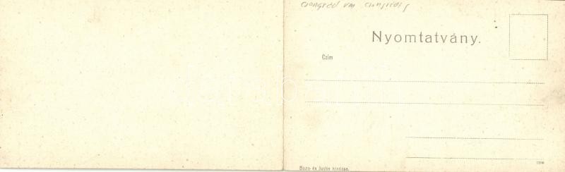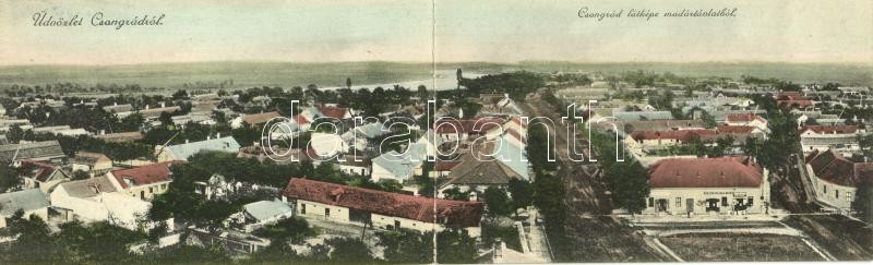 Csongrád, látkép madártávlatból, Tóbiás Herman üzlete, bor, sör és pálinka mérés, Mészárszék. Kinyitható panorámalap