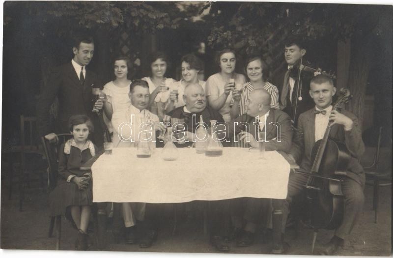 Hajdúdorog, Mulatozó társaság a vendéglő kertjében, zenészek. Burg I. műterme, Hajdúnánás, Andrássy u. 2466. photo