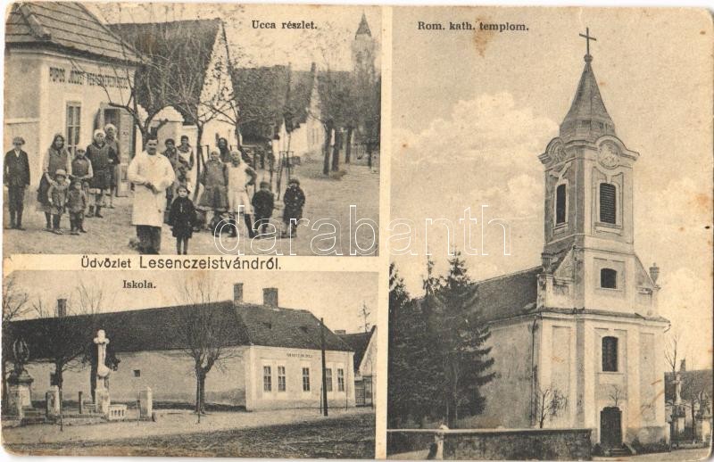 Lesenceistvánd, Római katolikus templom, iskola, utca, Pupos József vegyeskereskedése (EK)