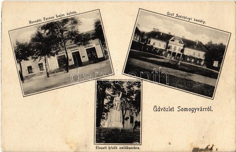 Somogyvár, Gróf Széchenyi kastély, Elesett hősök emlékszobra, Horváth Ferenc Lajos üzlete és saját kiadása (Rb)