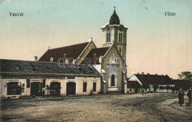 Vasvár, Fő tér, fogyasztási szövetkezet, templom