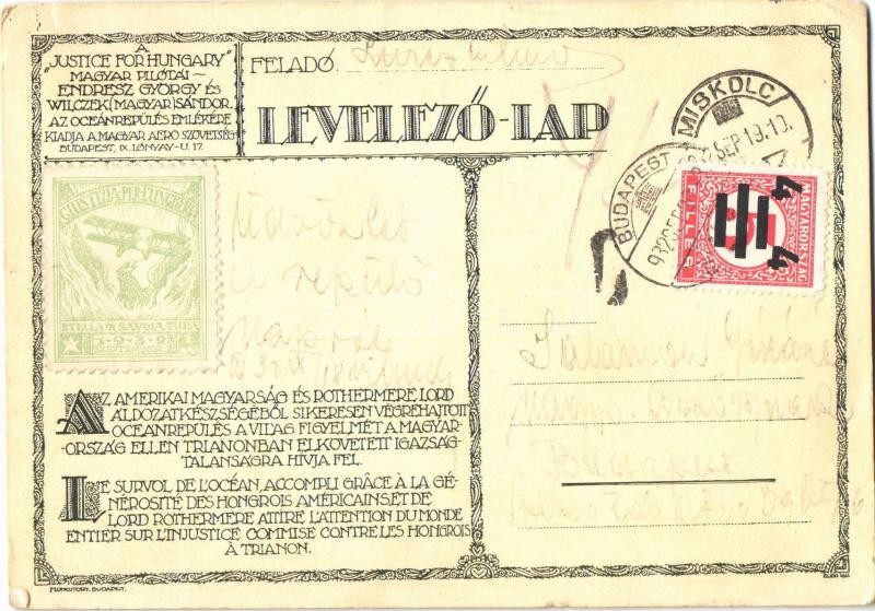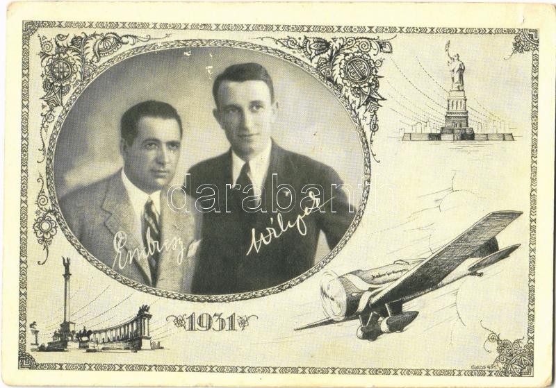 Description: 1931 Endresz György és Wilczek (Magyar) Sándor "Justice for Hungary" óceánrepülésének emlékére / Hungarian pilots, memorial card for their flight across the ocean. Irredenta Art Nouveau postcard (szakadás / tear)