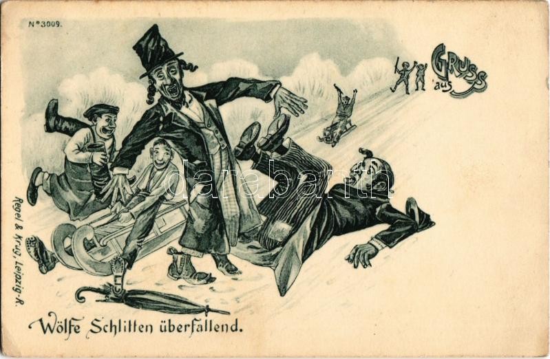 Description: Gruss aus Wölfe Schlitten überfallend. Regel & Krug Leipzig No. 3009. / Wolves attacked by sleighs in winter. Jewish men falling. Judaica mocking art postcard (EK)