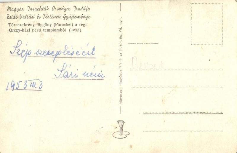 Tóraszekrény-függöny (Parochet) a régi Orczy-ház pesti templomából (18... https://www.darabanth.com/en/32-Major-auction/32.1/Postcards/Judaica~13800/Toraszekreny-fuggony-Parochet-a-regi-Orczy-haz-pesti-templomabol-1852-Magyar-Izraelitak~II2047046