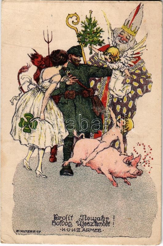 Description: 1917 Boldog Újesztendőt! Mikulás és Krampusz katonával / Prosit Neujahr K.u.K. II. Armee / New Year greeting, Saint Nicholaus, Krampus, soldier. litho s: E. Kutzer (EK)