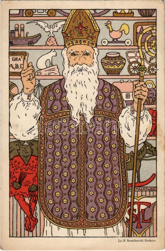 Saint Nicholaus and Krampus. Lit. K. Kranikowski Kraków. Wydawnictwo Zarzadu glównego Tow. Szkoly Ludowej w Krakowie. litho s: B. Malkowski (EB)