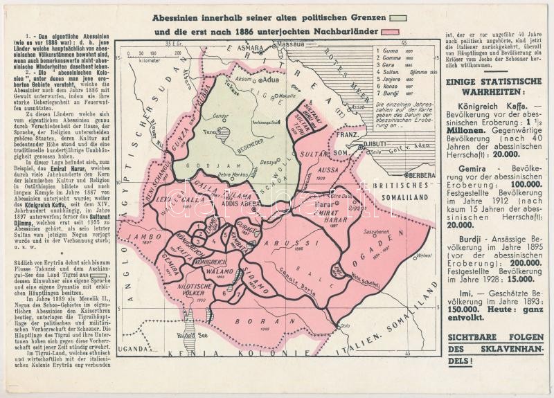 Description: Abessinien innerhalb seiner alten politischen Grenzen und die erst nach 1886 unterjochten Nachbarländer. Einige Statistische Wahrheiten / Abyssinia (Ethiopian Empire) within its old political borders and neighboring countries subjugated only after 1886. Some statistical truths. Unfolded postcard (EK)