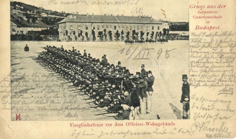 Description: 1898 (Vorläufer!) Budapest II. Lipótmező, Hidegkúti út. Cs. és Kir. gyalogsági hadapród iskola, tüzelés, lőgyakorlat a tiszti lakóépület előtt / K.u.K. Infanterie-Cadetten-Schule, Viergliederfeuer vor dem Officers-Wohngebäude (EK)