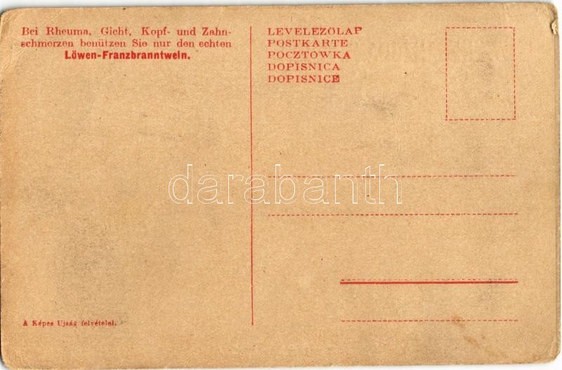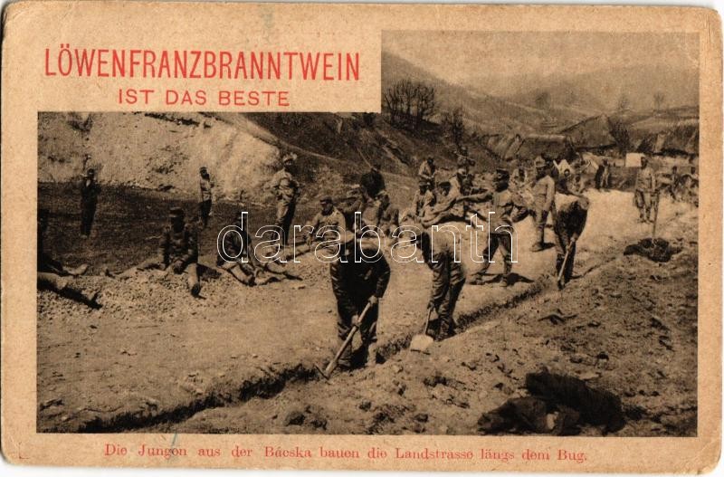 Description: Löwen-Franzbranntwein ist das Beste. Die Jungen aus der Bácska bauen die Landstrasse längs dem Bug / German rubbing alcohol's advertisement. K.u.K soldiers from Bácska building a road. Képes Újság (EK)