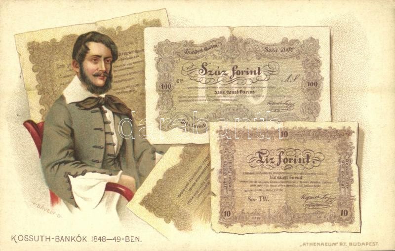 Description: Kossuth-bankók 1848-49-ben. Jelenetek Kossuth Lajos élete történetéből I. kiadás IV. kép / Kossuth bank notes from 1848-49. Scenes from the life of Lajos Kossuth. Athenaeum rt. litho s: K. Sávely D.