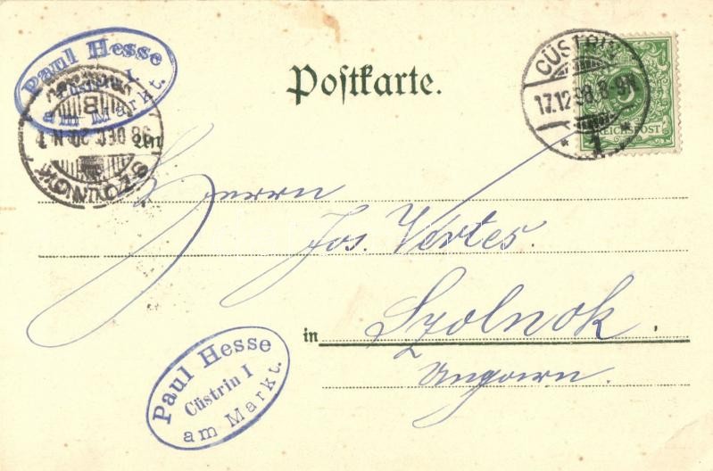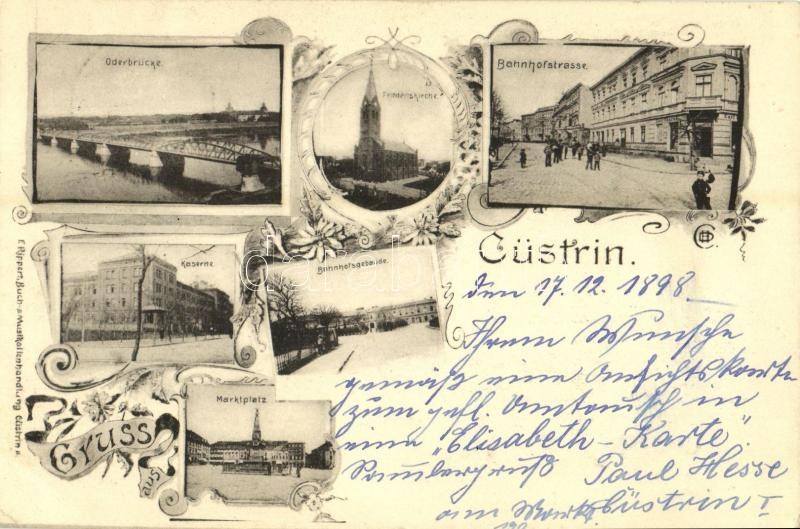 1898 Kostrzyn, Cüstrin; Oderbrücke, Kaserne, Marktplatz, Friedenskirche, Bahnhofstrasse, Bahnhofsgebäude / Odra bridge, military barrack, square, church, street, railway station. Art Nouveau, floral (EK)