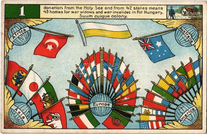 Description: 1922 Segélylap a fóti Suum Cuique Alap hadiözvegy és hadirokkant telep építésére. 43 otthont hoztak létre. Amerikai kiadás, zászlós litho / Charity postcard for the Suum Cuique Fund of the WWI war widows and war invalides in Fot, Hungary. American edition. Flags, litho