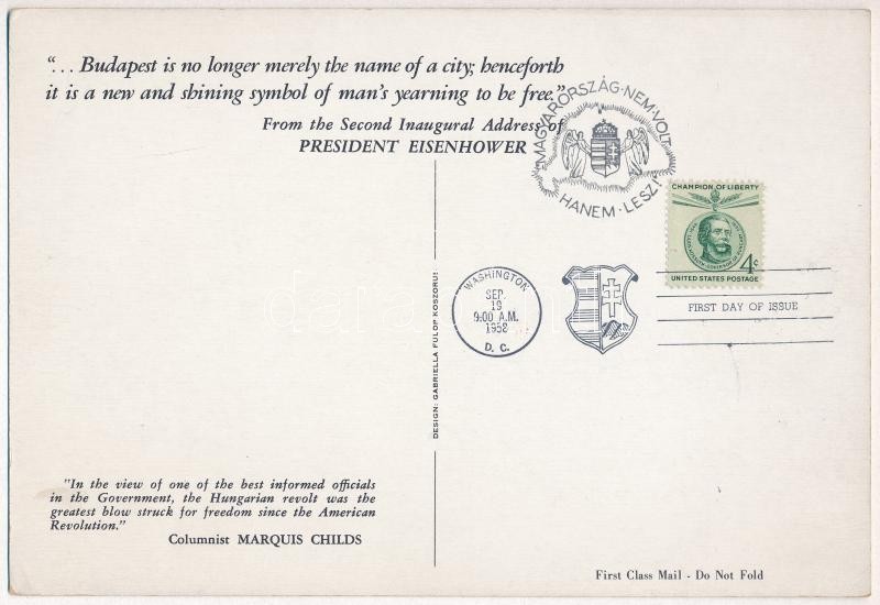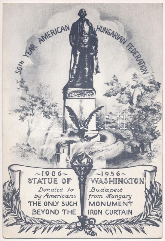 1958 Amerikai kiadású propagandalap az Amerikai Magyar Szövetség 50. évfordulójára, A Washington szobor melyet magyar amerikaiak adományoztak Budapestnek. Óriás képeslap / 50th Year American Hungarian Federation. Statue of Washington donated to Budapest by Americans from Hungary + "Magyarország nem volt hanem lesz" So. Stpl s: Gabriella Fülöp Koszorús (giant postcard 22,9 cm x 15,2 cm)